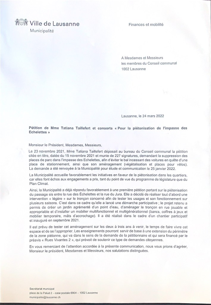 Courrier de la Ville de Lausanne reçue le 24 mars 2022