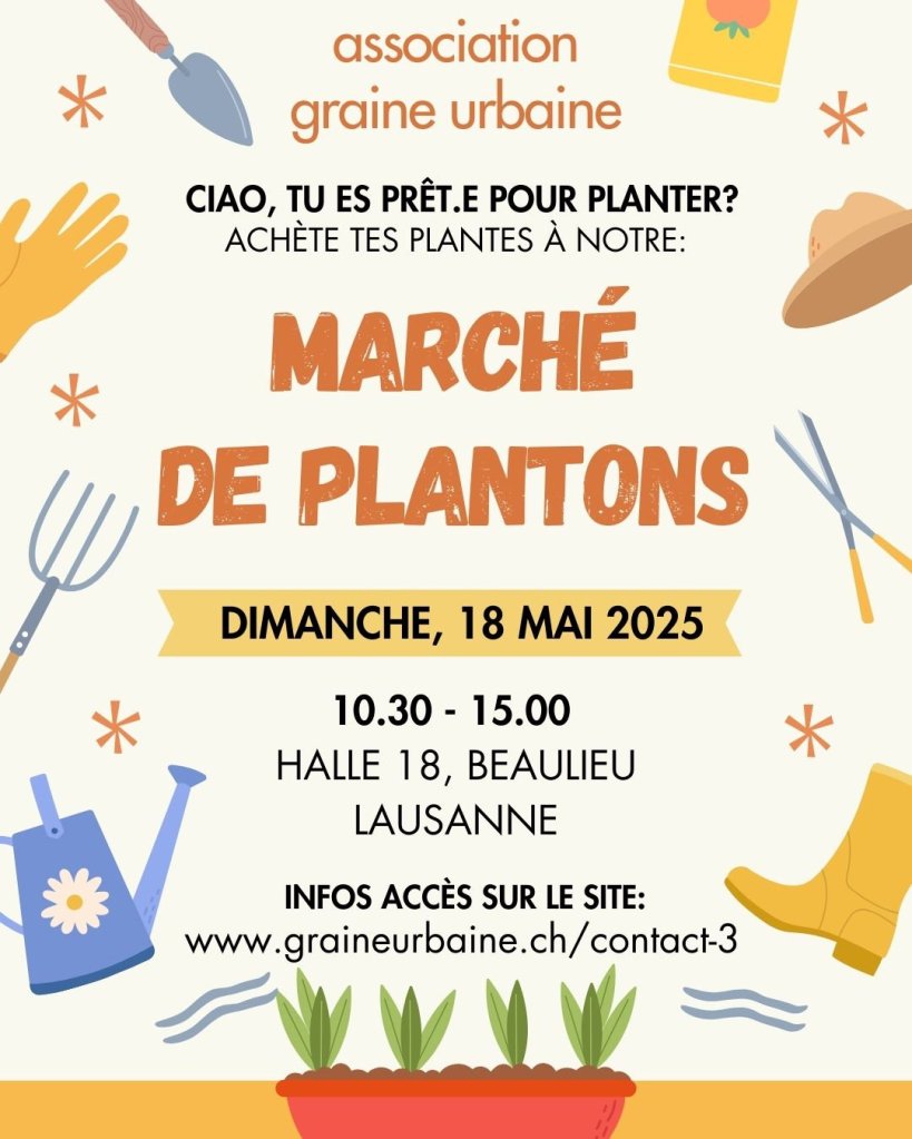 Nous avons le plaisir de vous inviter au marché de plantons de Graine Urbaine (paiement par cash ou Twint). Si vous avez commandé des plantons, ce sera l’occasion de venir récupérer votre commande.